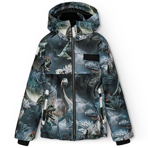 Vind- och vattentät vinterjacka i återvunnen polyester för en kall vinter med ett tryck av dinosaurier i rymden i blåa, gröna och bruna nyanser. Jackan har en avtagbar fodrad huva och en dragkedja med överlappande flik för att hålla ute snö, vind och vatten. Jackan har flera stora reflexer för att öka synligheten i trafiken. Jackan har fodrade fickor med dragkedja samt en justerbar resår i nederkanten av jackan för att hålla värmen inne och vinden ute. Ärmarna har ribbstickade muddar, som effektivt håller ute vind, snö och regn samtidigt som de ser till att vantar håller sig på plats. Jackan är fodrad med 3M™ Thinsulate™, vilket ger barnet större rörlighet.