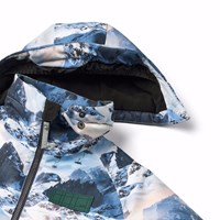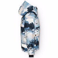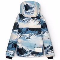 Vind- och vattentät vinterjacka i återvunnen polyester för en kall vinter med ett tryck av ett vinterlandskap i blå nyanser. Jackan har en avtagbar fodrad huva och en dragkedja med överlappande flik för att hålla ute snö, vind och vatten. Jackan har flera stora reflexer för att öka synligheten i trafiken. Jackan har fodrade fickor med dragkedja samt en justerbar resår i nederkanten av jackan för att hålla värmen inne och vinden ute. Ärmarna har ribbade muddar, som effektivt håller ute vind, snö och regn samtidigt som de ser till att vantar håller sig på plats. Jackan är fodrad med 3M™ Thinsulate™, vilket ger barnet större rörlighet.
