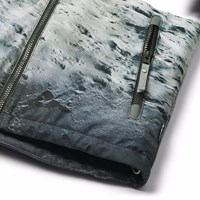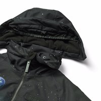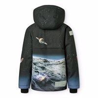 Vind- och vattentät svart och blå vinterjacka i återvunnen polyester med ett tryck av mannen på månen. Jackan har en avtagbar fodrad huva, praktisk dragkedja, dragkedjefickor med fleece, ribbade ärmslut och resår i botten för att effektivt skydda mot vinden. På baksidan finns en stor reflex som ökar synligheten i trafiken. Dessutom är jackan fodrad med fleece och vadderad med 3M™ Thinsulate™.