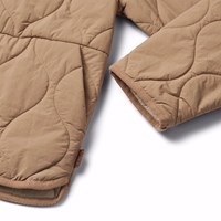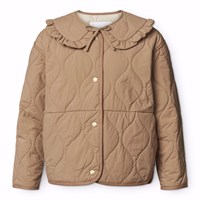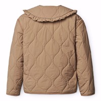 Brun vattenavvisande termojacka i återvunnen nylon med quiltat mönster och avtagbar volangkrage. Jackan har en normal passform, sidofickor, knäppning med knappar framtill och matchande kantband för en stilren finish.