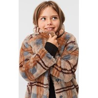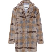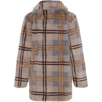 Haili är en mjuk fuskpälskappa i beige med brun- och ljusblå rutor. Kragen kan användas både upp- och nervikt och kappan stängs med knappar.
