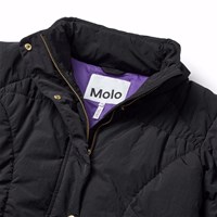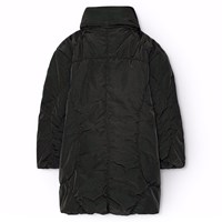 Vattenavvisande svart jacka i återvunnen nylon. Jackan har raglanärmar och en stilren silhuett med mjuka linjer, vilket ger den en sofistikerad look. Jackan är knälång med en stående krage och integrerad huva. Den har en dragkedja med överlappande flik som håller ute snö, vind och vatten. Jackan har framfickor och gummiband vid ärmslut och nertill, vilket håller ute vinden och behåller värmen bättre. Jackan är fodrad med ett återvunnet polyesterfyll som garanterar jämn mjukhet, optimal värme och enkel skötsel vid tvätt. Jackans vattenavvisande yta är fri från PFOS och PFOA.