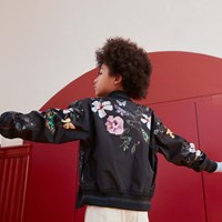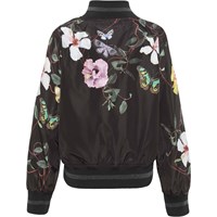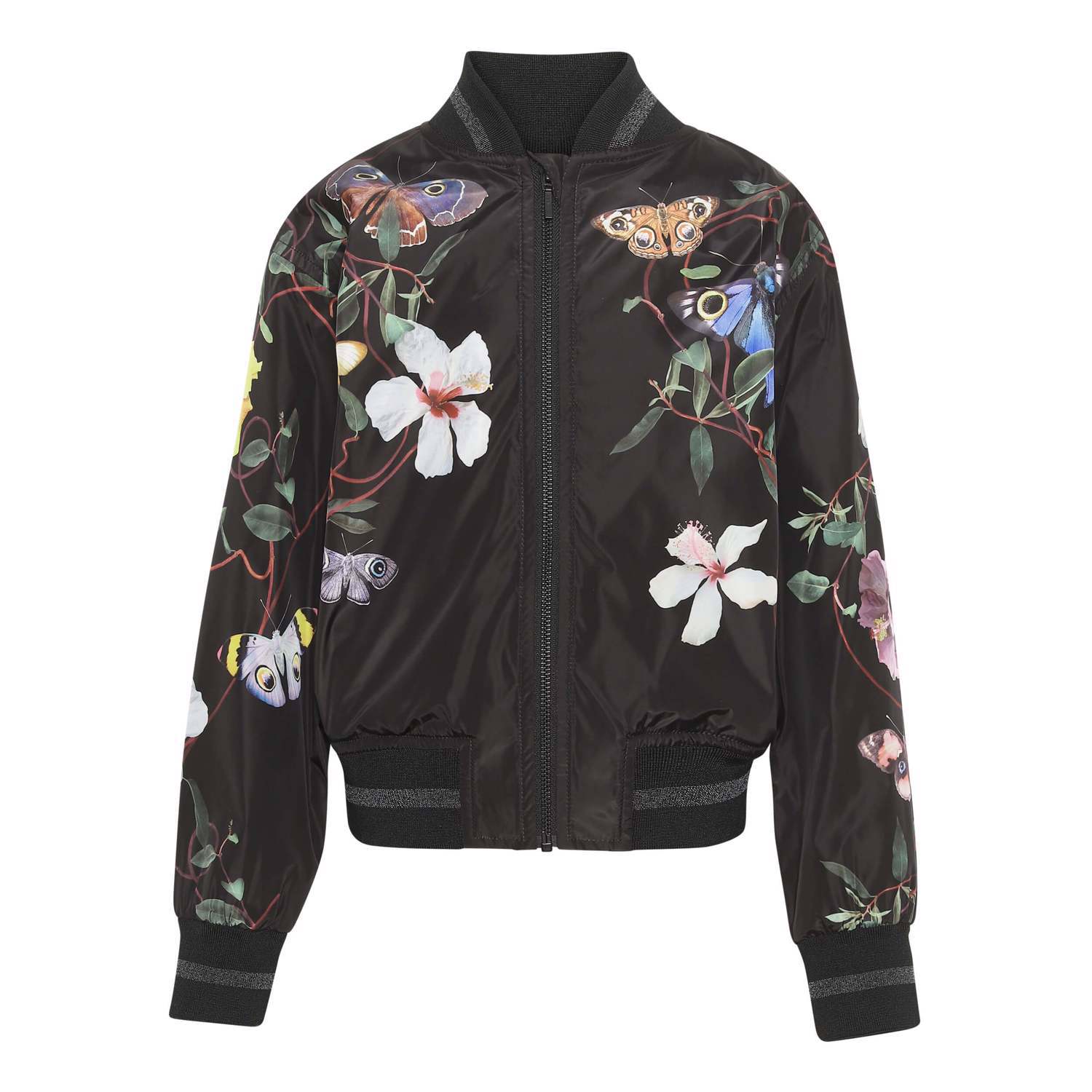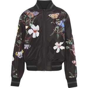 Haliva är en mörk bomberjacka med blommor och fjärilar. Haliva har svart ribbkant vid hals, handleder och höfter.