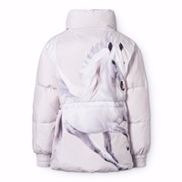 Vattenavvisande ljus jacka i återvunnen polyester med en vit pegasus på baksidan. Jackan har en dragkedja framtill, en ståkrage med integrerad huva, sidofickor och en justerbar inre resår i midjan för en smickrande silhuett och bättre värmebevaring. Jackan är fodrad med återvunnen polyesterfyllning för jämn mjukhet och optimal värmeisolering. Jackans vattenavvisande yta är fri från PFOS och PFOA.