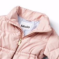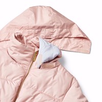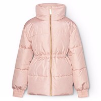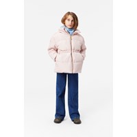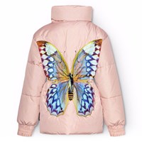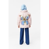 Vattenavvisande rosa jacka i återvunnen polyester med ett snyggt tryck på ryggen av en fjäril. Jackan har en stående krage med integrerad huva och en dragkedja framtill. Den har sidofickor och justerbart gummiband på insidan, vilket skapar en fin silhuett och hjälper även till att behålla värmen. Jackan är fodrad med en återvunnen polyesterfyllning som garanterar jämn mjukhet, optimal värme och enkel skötsel vid tvätt. Jackans vattenavvisande yta är fri från PFOS och PFOA.