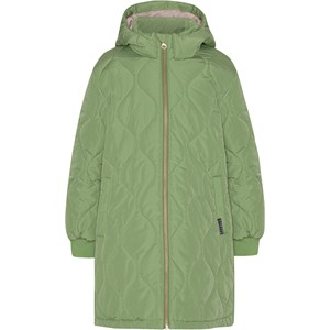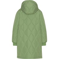 Blød quilted dynefrakke i lysegrøn med lynlås ned langs fronten, aftagelig hætte, lynlåslommer på begge sider og bred elastisk rib ved ærmegab. Den er foret med imiteret dunfyld kaldet Pearl Padding, som giver en ensartet blødhed, holder godt på varmen og gør vask nemmere. Der er anvendt en vand- og smudsafvisende coating uden brug af kemikalier som PFOS, PFOA og lignende.