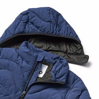 Blå vattenavvisande pufferjacka tillverkad av återvunnen nylon. Jackan har en avtagbar huva, en ståkrage, en dragkedja med hake och dragkedjefickor framtill.