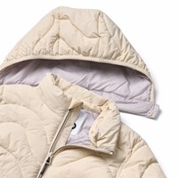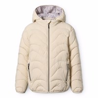 Off-white vattenavvisande pufferjacka tillverkad av återvunnen nylon. Jackan har en avtagbar huva, en ståkrage, en dragkedja med hake och dragkedjefickor framtill.