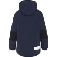 Harding är en blå jacka med stora ljusa fickor framtill, luva, reflexer och fint innerfoder med mönster av universum. Jackan har dragkedja framtill med överlapp, fickor i sidorna och vindskydd vid ärmslut och nertill. Jackan är fodrad med tekniskt dun, kallat pearl padding, som ger en extra mjukhet, håller värmen bra och ger en dunliknande känsla. Denna vara har en vattenavvisande PFC-fri impregnering (innehåller t.ex. inte PFOS, PFOA eller liknande). Vattenpelare: 10.000 mm. Andningsförmåga: 8.000 g/m2/24t.
