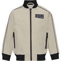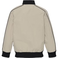 Harl är en sandfärgad bomberjacka med svarta dragkedjor och sömmar, samt ribbad fåll i nacken, botten och ärmslut.
