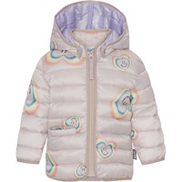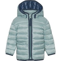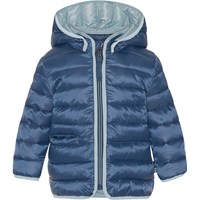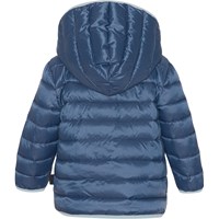 Mørkeblå dynejakke til de mindste med lyseblå inderside og kanter. Jakken har aftagelig hætte, opretstående krave og lynlås med hagebeskytter og en enkel lomme på fronten. Jakken er foret med imiteret dunfyld kaldet Pearl Padding, som giver ensartet blødhed, holder godt på varmen og gør vask nemmere. Der er anvendt en vand- og smudsafvisende coating, uden brug af kemikalier som PFOS, PFOA og lignende.