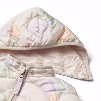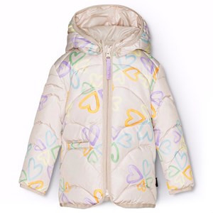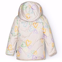 Vattenavvisande lila puffjacka för baby och småbarn, med pärlemorsfärgat foder och kantband. Jackan har en avtagbar huva, stående krage, dragkedja med hakskydd och en enda ficka på framsidan. Jackan har ett mönster av pastellfärgade hjärtan som bildar klöver. Jackan och vadderingen är i återvunnen polyester. Den vattenavvisande ytan är fri från PFOS och PFOA. Kobinera den med matchande byxor och få ett varmt och mjukt termoset.