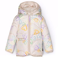 Vattenavvisande puffjacka för baby och småbarn, med ljusblått foder och kantband. Jackan har en avtagbar huva, stående krage, dragkedja med hakskydd och en enda ficka på framsidan. Jackan har ett mönster av ett snöigt landskap med lekfulla isbjörnar. Jackan och vadderingen är i återvunnen polyester. Den vattenavvisande ytan är fri från PFOS och PFOA.