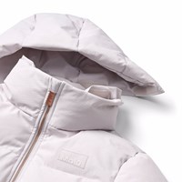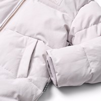 Vind- och vattenavvisande ljuslila jacka i återvunnen nylon med praktisk dragkedja, hög krage och avtagbar huva. Jackan går till ovanför knäet och är designad med framfickor, en innerficka och ribbade muddar. Höga slitsar med tryckknappar på båda sidor säkerställer stor rörelsefrihet och gör jackan praktisk för cykling. En stor reflex på baksidan ökar synligheten i trafiken. Jackan är fodrad med mjukt, återvunnet polyesterfyllning för jämn komfort och optimal värmeisolering.
