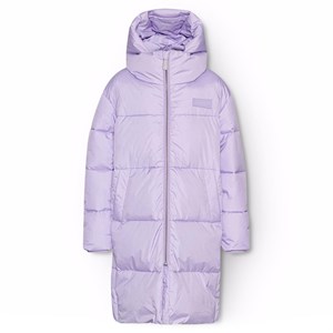 Ljuslila dunjacka i återvunnen polyester som är perfekt för en kall vinter. Jackan når ner över knäet, har en avtagbar huva, sidofickor och ärmar med ribbstickade muddar, som effektivt håller ute vind, snö och regn samtidigt som handskar hålls på plats. Den har höga slitsar på båda sidor, som kan stängas med tryckknappar, vilket ger stor rörelsefrihet och gör det enkelt att cykla i jackan. Jackan har en stor reflex på baksidan för att öka synligheten i trafiken.