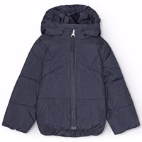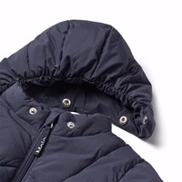 Vattenavvisande mörkblå jacka för baby och småbarn i återvunnen nylon. Jackan har en avtagbar huva, dragkedja och fickor på framsidan, samt elastik vid ärmsluten och nederkanten som hjälper ditt barn att hålla sig varmt. Jackan är fodrad med ett återvunnet polyesterfyll som garanterar jämn mjukhet, optimal värme och enkel skötsel vid tvätt. Jackans vattenavvisande yta är fri från PFOS och PFOA.