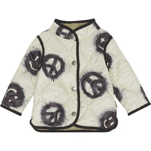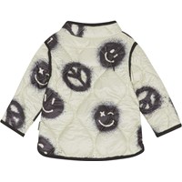 Harrie er en beige quilted baby jakke med sorte kontrast kanter og print af peace tegn og smileyer. Jakken har knappelukning på fronten.