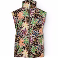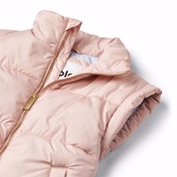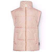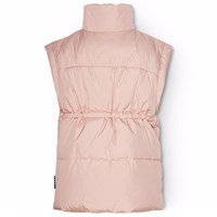 Puderfärgad quiltad väst i återvunnen polyester. Västen har en stående krage, dragkedja framtill och stora ärmhål, vilket gör att en jacka eller tjocktröja kan bäras under. Den har framfickor och en invändigt gummiband i midjan, vilket hjälper till att skapa en smickrande silhuett. Den vattenavvisande ytan är fri från PFOS och PFOA.