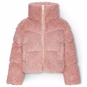 Quiltad rosa jacka i fuskpäls med fårskinnslook. Jackan har en stående krage, framfickor och dragkedja.