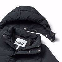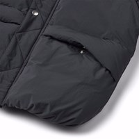 Vattenavvisande svart jacka i återvunnen nylon. Jackan har en avtagbar huva och en dragkedja med överlappande flik som håller borta snö, vind och vatten. Det finns fickor framtill och en justerbar resår nertill, som håller borta vinden och behåller värmen bättre. Jackan är fodrad med en återvunnen polyesterfyllning som säkerställer jämn mjukhet, optimal värme och enkel skötsel vid tvätt. Jackans vattenavvisande yta är fri från PFOS och PFOA.