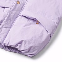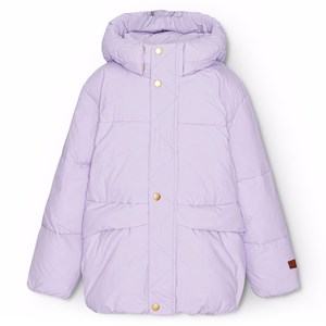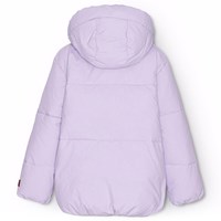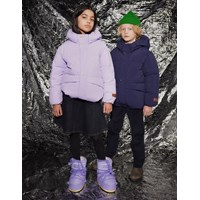 Vattenavvisande lila jacka i återvunnen nylon. Jackan har en avtagbar huva och en dragkedja med överlappande flik som håller ute snö, vind och vatten. Det finns fickor framtill och en justerbar resår nertill, som håller ute vinden och behåller värmen bättre. Jackan är fodrad med en återvunnen polyesterfyllning som garanterar jämn mjukhet, optimal värme och enkel skötsel vid tvätt. Jackans vattenavvisande yta är fri från PFOS och PFOA.