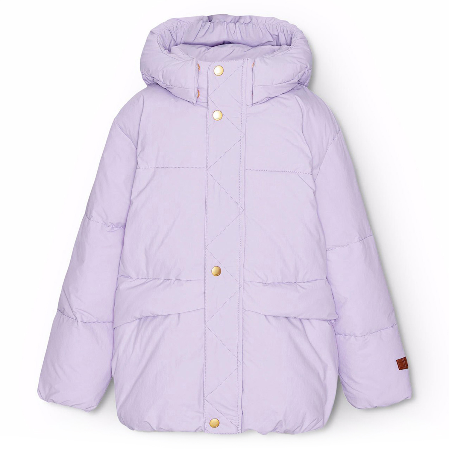 Vattenavvisande lila jacka i återvunnen nylon. Jackan har en avtagbar huva och en dragkedja med överlappande flik som håller ute snö, vind och vatten. Det finns fickor framtill och en justerbar resår nertill, som håller ute vinden och behåller värmen bättre. Jackan är fodrad med en återvunnen polyesterfyllning som garanterar jämn mjukhet, optimal värme och enkel skötsel vid tvätt. Jackans vattenavvisande yta är fri från PFOS och PFOA.