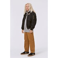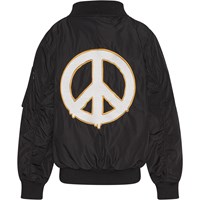Svart bomberjacka med stort broderat peacetecken på ryggen och ett mindre framtill. Bomberjackan har ribbkant vid halsen, handleder och höfter. Jackan har fickor med tryckknappar och en extra ficka med dragkedja på vänster arm.