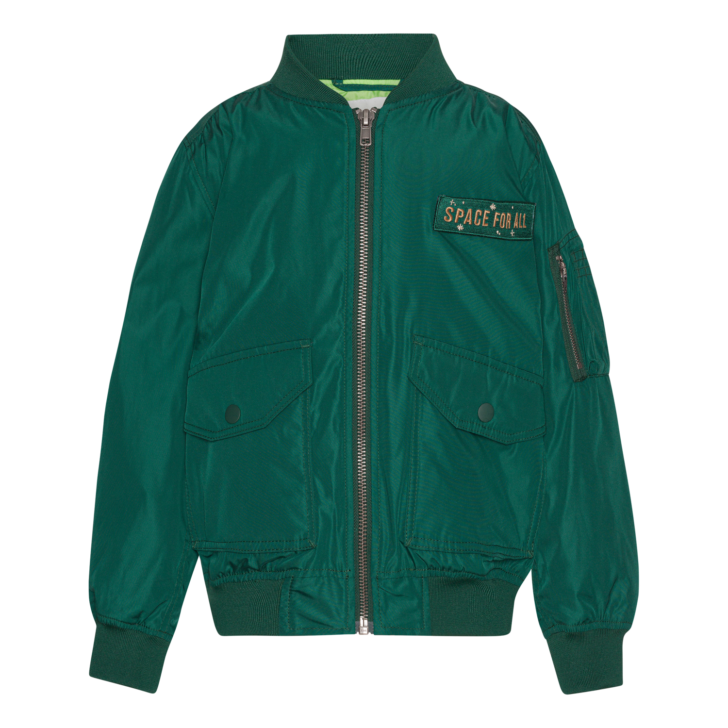 Mörkgrön bomberjacka med avtagbar patch framtill med texten "Space for all". Bomberjackan har ribbkant vid halsen, handleder och höfter. Jackan har fickor med tryckknappar och en extra ficka med dragkedja på vänster arm.