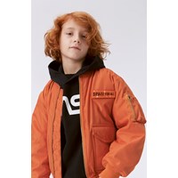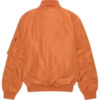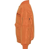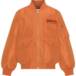 Orange bomberjacka med avtagbar patch framtill med texten "Space for all". Bomberjackan har ribbkant vid halsen, handleder och höfter. Jackan har fickor med tryckknappar och en extra ficka med dragkedja på vänster arm.