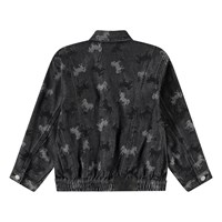 Mörkgrå denimjacka i mjuk bomull med ett vävt mönster av svarta och ljusgrå hästar. Jackan har en skjortkrage, knäppning framtill med knappar och fickor på bröstet och i sidorna. På baksidan har jackan resår i midjan, vilket ger den en oversized look. Storlekarna 92-134 har tryckknappar, vilket gör det lättare för barn att knäppa jackan själva. Storlekarna 140-176 har en vanlig knäppning med knappar.