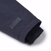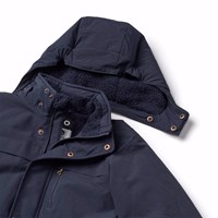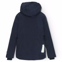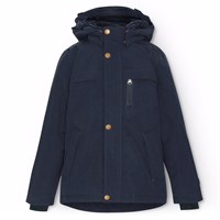 Mörkblå vind- och vattentät vinterjacka i återvunnen nylon för en kall vinter. Jackan har en avtagbar fodrad huva och en dragkedja med överlappande flik som håller snö, vind och vatten ute. Jackan har en stor reflex på baksidan för att öka synligheten i trafiken. Jackan har fodrade framfickor och en bröstficka med dragkedja, samt en justerbar midjeresår som ger form och passform runt kroppen. Ärmarna har ribbstickade muddar, som effektivt håller ute vind, snö och regn samtidigt som de ser till att vantar hålls på plats.