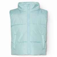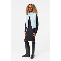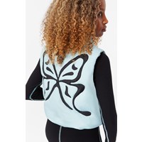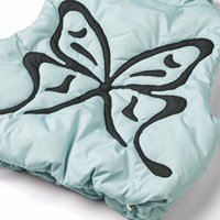 Ljusblå quiltad väst i återvunnen polyester med en broderad svart fjäril på baksidan. Den har en ståene krage, dragkedja framtill och stora ärmhål, vilket gör att en jacka eller tjocktröja kan bäras under. Den har framfickor och invändigt gummiband i midjan, vilket hjälper till att skapa en smickrande silhuett. Den vattenavvisande ytan är fri från PFOS och PFOA.