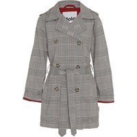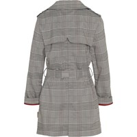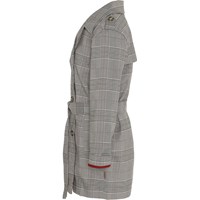Hildegarde är en grå rutig trenchcoat med dubbel knappknäppning framtill och knytband vid midjan. Jackan har snyggt rött foder.