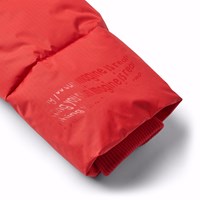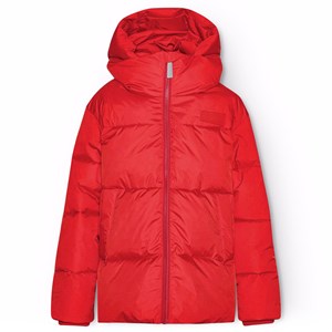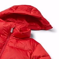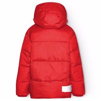 Röd pufferjacka i återvunnen polyester som är perfekt för en kall vinter. Jackan har en avtagbar huva, sidofickor och ärmar med ribbstickade muddar som effektivt håller ute vind, snö och regn samtidigt som handskar hålls på plats. Jackan har en stor reflex på baksidan för att öka synligheten i trafiken.