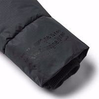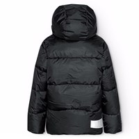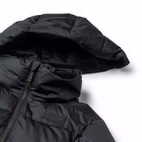 Svart pufferjacka i återvunnen polyester som är perfekt för en kall vinter. Den har en avtagbar huva, sidofickor och ärmar med ribbstickade muddar som effektivt håller ute vind, snö och regn samtidigt som handskar hålls på plats. Jackan har en stor reflex på baksidan för att öka synligheten i trafiken.