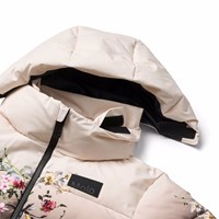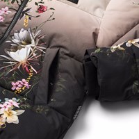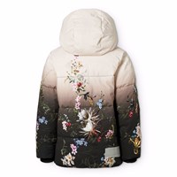 Varm och funktionell jacka i återvunnen polyester med praktisk dragkedja, hög krage och avtagbar huva. Jackan är designad med framfickor, en innerficka, ribbade ärmslut och justerbar resår i nederkanten för att skydda mot vinden. Det finns en stor reflex på baksidan för ökad synlighet i trafiken. Jackan är fodrad med mjuk, återvunnen polyesterfyllning för jämn komfort och optimal värmeisolering. Jackan har ett mönster av färgglada blommor som matchar den ljusa och mörka gradientfärgade bakgrunden.