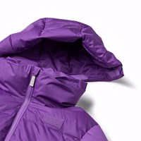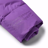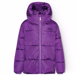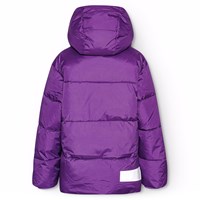 Lila pufferjacka i återvunnen polyester som är perfekt för en kall vinter. Jackan har en avtagbar huva, sidofickor och ärmar med ribbstickade muddar, vilket effektivt håller ute vind, snö och regn samtidigt som handskar hålls på plats. Jackan har en stor reflex på baksidan för att öka synligheten i trafiken.