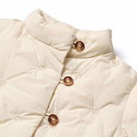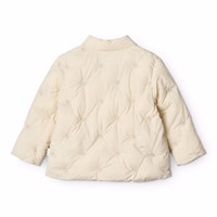 Off-white vattenavvisande quiltad jacka för de små gjord av återvunnen nylon med broderade små smileys. Jackan har en ståkrage och stängs med tre knappar framtill. Dessutom har jackan en fyllning av återvunnen polyester som ger jämn mjukhet och optimal värmeisolering och den vattenavvisande ytan är fri från PFOS och PFOA.