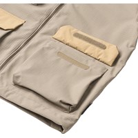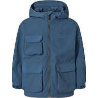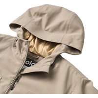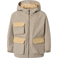 Sandfärgad funktionell jacka som är vind- och vattentät i återvunnen nylon med ton-i-ton-rutig struktur. Jackan har en avtagbar huva, stora framfickor med kontrastlock och kardborrestängning, och är justerbar vid handlederna. Ett hållbart och praktiskt val för utomhuslek.
