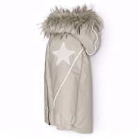 Grå vind- och vattentät vinterjacka i återvunnen polyester för en kall vinter. Jackan har en avtagbar fodrad huva med avtagbar fuskpälskant och två dragkedjor på framsidan med hakskydd för att förhindra att huden fastnar. Dragkedjorna har invändig överfall, som hjälper till att hålla snö, vind och vatten ute. Jackan har reflexer på ärmarna, baksidan och huvan, samt två stjärnreflexer på ärmarna, för att öka synligheten i trafiken. Ärmarna har en elastisk kant som effektivt håller vind, snö och regn ute samtidigt som vantar hålls på plats. Jackan är fodrad med fleece och 3M™ Thinsulate™, vilket ger barnet större rörlighet på grund av sin lätta vikt.