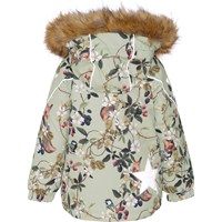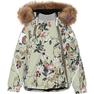 Hopla Fur är en funktionell och vattentät vinterjacka i grön med bär och blommor. Hopla Fur är perfekt till både extrem kyla och vanliga vintrar på grund av dess otroligt höga andningsförmåga och isolering. Den höga andningsförmågan hjälper till att reglera kroppstemperaturen och ser till att ditt barn varken blir för varmt eller kallt. På varmare vinterdagar kan barnet därför ha tunnare lager under och på de riktigt kalla dagarna kan man kompletterna med ett extra lager under. Har du ett stillasittande barn är Hopla Fur också ett bra val. Jackan har avtagbar luva med fuskpälskant (som också är avtagbar), sned dragkedja fram, ribbkant vid hals, gummiband vid ärmslut och Molo´s välkända stjärnreflex på båda överarmar och baktill. Dessutom har jackan högkvalitativ fleece på utasatta områden och tejpade sömmar. Yttermaterialet är tillverkat av 45% återvunnen polyester, the 3M™ Thinsulate™ fodret av 78% återvunnen polyester och materiale av 100% återvunnen polyester. Denna vara har en vattenavvisande PFC-fri impregnering (innehåller t.ex. inte PFOS, PFOA eller liknande). Vattenpelare: 15.000 mm. Andningsförmåga: 15.000 g/m2/24t.