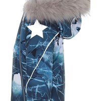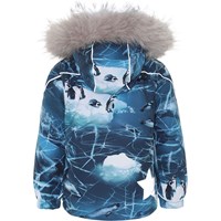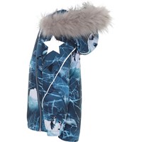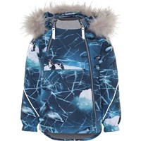 Hopla Fur är en funktionell och vattentät vinterjacka i Molo's tryck 'Frozen Ocean'. Jackan har avtagbar huva med faux fur pälskant (som även är avtagbar), snedställd dragkedja fram, ribb vid hals, resår i ärmslut samt Molo's karakteristiska reflexstjärna på båda ärmarna och nedtill bak på jackan. Jackan är vind- och vattentät och har bra andningsförmåga, har 3M™ Thinsulate™ foder, fleece i hög kvalitet vid utsatta områden och tejpade sömmar. Produkten har en vattenavvisande PFC-fri impregnering (innehåller ej PFOS, PFOA eller liknande). Vattenpelare: 10.000 mm. Andningsförmåga: 8.000 g/m2/24t.