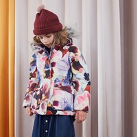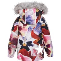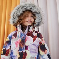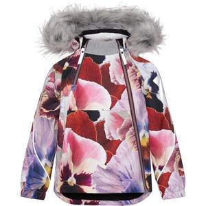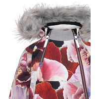Hopla Fur är en funktionell och vattentät vinterjacka med stora blommor i varmar färger och Molos välkända reflexstjärna på ärmarna och baktill. Jackan har avtagbar huva med fuskpälskant (som också går att ta av), sned dragkedja, ribbad kant vid halsen och muddar vid ärmsluten. Jackan har också högkvalitativ fleece  på utsatta områden och tejpade sömmar. Foder och innermaterial är återvunnet och tillverkat av återvunnen polyester. Denna produkt har en PFC- fri impregnering (innehåller t.ex. inte PFOS, PFOA och liknande). Vattenpelare och andningsförmågan är ytterligt förbättrad och är nu helt uppe i 15.000mm i vattenpelare och andningsförmågan på 15.000 g/m2/24t.