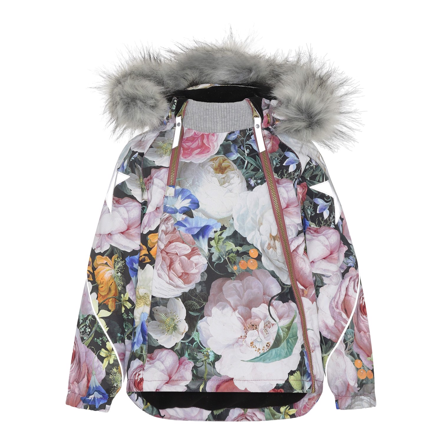 Hopla Fur är en funktionell och vattentät vinterjacka med blomor. Hopla Fur är perfekt till både extrem kyla och vanliga vintrar på grund av dess otroligt höga andningsförmåga och isolering. Den höga andningsförmågan hjälper till att reglera kroppstemperaturen och ser till att ditt barn varken blir för varmt eller kallt. På varmare vinterdagar kan barnet därför ha tunnare lager under och på de riktigt kalla dagarna kan man kompletterna med ett extra lager under. Har du ett stillasittande barn är Hopla Fur också ett bra val. Jackan har avtagbar luva med fuskpälskant (som också är avtagbar), sned dragkedja fram, ribbkant vid hals, gummiband vid ärmslut och Molo´s välkända stjärnreflex på båda överarmar och baktill. Dessutom har jackan högkvalitativ fleece på utasatta områden och tejpade sömmar. Yttermaterialet är tillverkat av 45% återvunnen polyester, the 3M™ Thinsulate™ fodret av 78% återvunnen polyester och materiale av 100% återvunnen polyester. Denna vara har en vattenavvisande PFC-fri impregnering (innehåller t.ex. inte PFOS, PFOA eller liknande). Vattenpelare: 15.000 mm. Andningsförmåga: 15.000 g/m2/24t.