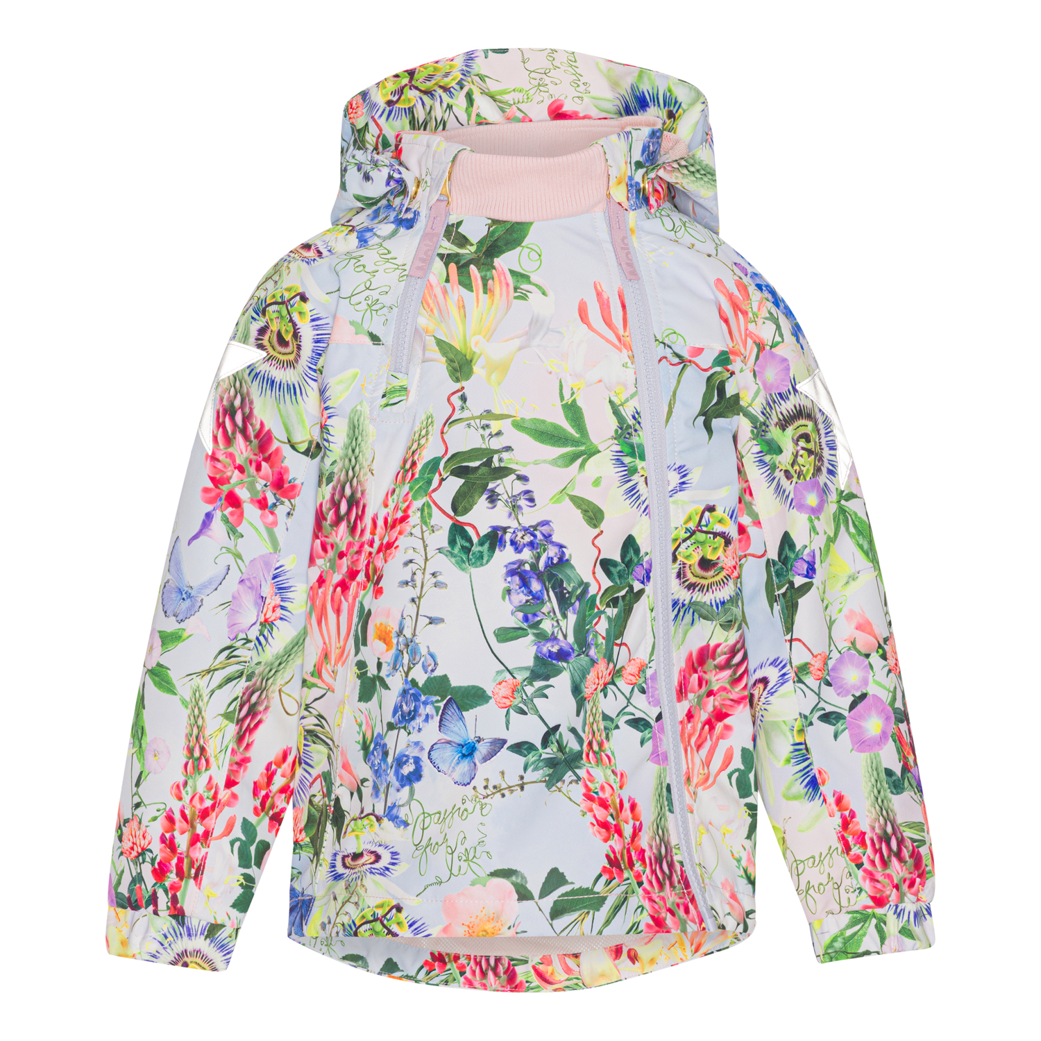 Hopla er en af Molo's klassikere med et anorak look, her i en let sommerudgave i lyseblå med blomster print. Jakken har en aftagelig hætte, skrå lynlåse, samt justerbar bund og Molo's velkendte refleksstjerne på siden af begge ærmer og bagpå. Jakken passer til det meste vejr på grund af sin vandtæthed og gode åndbarhed. Sømmene er også tapede. Produktet har en vandafvisende PFC-fri imprægnering (indeholder f.eks. ikke PFOS, PFOA og lignende). Vandsøjletryk: 5.000 mm. Åndbarhed: 5.000 g/m2/24t.