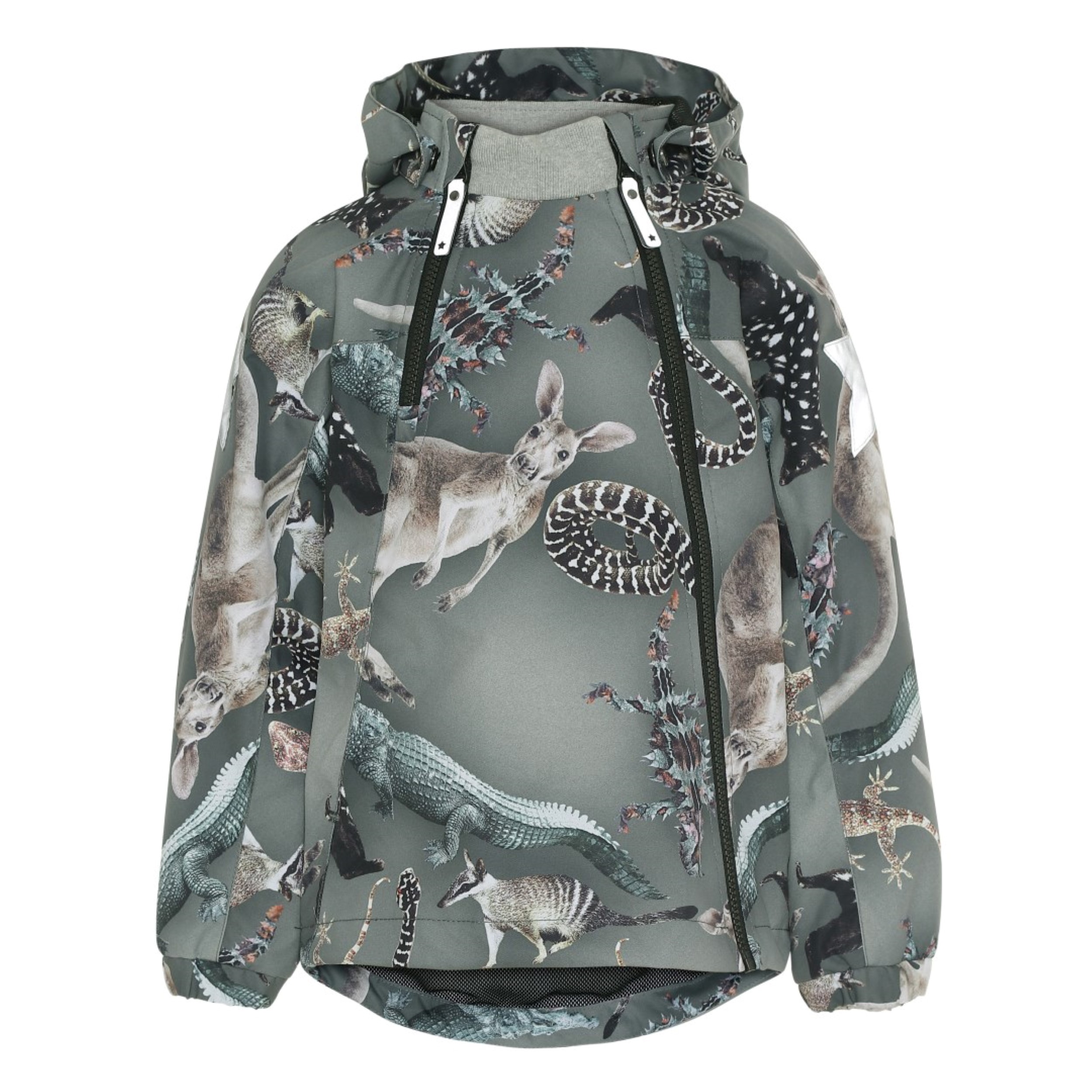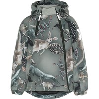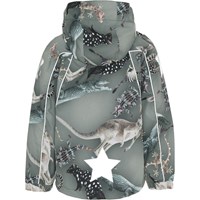 Hopla är en av Molo's klassiker, här i en lätt sommarutgåva i grön med tryck av Australiens vilda djur. Hopla har en avtagbar huva, snedställd dragkedja, samt reglerbar nederkant och Molo's ikoniska reflexstjärna på sidan av båda ärmarna. Jackan passar till nästan alla slags väder på grund av sin goda andningsförmåga. Produkten har en vattenavvisande PFC-fri impregnering (innehåller ej PFOS, PFOA eller liknande). Vattenpelare: 5.000 mm. Andningsförmåga: 5.000 g/m2/24t