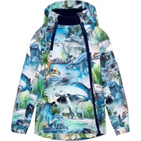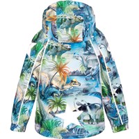 Uforet, anorak jakke i delvist genanvendt polyester med alloverprint i blå og grønne nuancer af forskellige dinosaurer. Jakken har opretstående krave med blød rib, aftagelighætte, diagonale lynlåse med hagebeskytter, elastiske ærmegab samt indvendig justerbar elastik ved hoften. På bagsiden er jakken udstyret med refleksbånd ligesom der er placeret store stjerneformede reflekser på både bagside og ærmer, hvilket sikrer stor synlighed i trafikken.