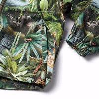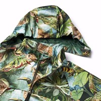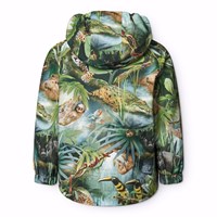 Grön vind- och vattentät jacka i återvunnen polyester med en färgglad heltryck av djuren i djungeln. Jackan har en avtagbar huva, fickor med vindslå, dragkedja med hakskydd och innerflik, samt elastiska ärmslut för att effektivt hålla ute vinden. Insidan har en justerbar resår i midjan för att anpassa silhuetten och passformen på jackan. Jackans tekniska egenskaper gör den lämplig som regnjacka.
