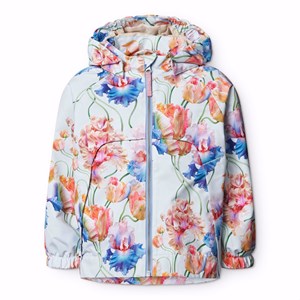 Ljusblå vind- och vattentät jacka i återvunnen polyester med ett färgglatt mönster av konstnärliga tulpaner. Jackan har en avtagbar huva, fickor med vindslå, dragkedja med hakskydd och invändig vindslå, samt elastiska ärmslut för att effektivt hålla ute vinden. Insidan har en justerbar resår i midjan för att anpassa silhuetten och passformen på jackan. Jackans tekniska egenskaper gör den lämplig som regnjacka.
