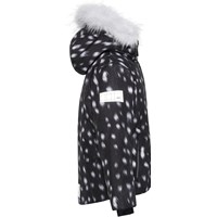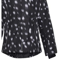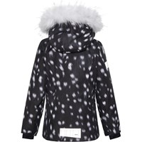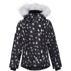 Pearson är en fuktionell och vattentät skidjacka i svart med vita fläckar och vit fuskpälskrage. Jackan har en avtagbar huva, dragkedja med asymetrisk överlappning, fickor i sidan, justerbara ärmslut och tätt vindskydd med hål för tummen. Pearson är vind- och vattentät, andas, har tejpade sömmar och reflexer på ärmarna. Jackans foder och innermaterial är återvunnet, tillverkat av återvunnen polyester. Denna produkt har en PFC- fri impregnering (innehåller t.ex. inte PFOS, PFOA och liknande). Vattenpelare: 15.000 mm. Andningsförmåga: 15.000 g/m2/24t.